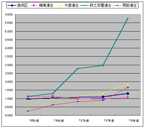 これを見ると、釜ヶ崎が元々男の目立つ街でないことがわかる。(年度が飛び飛びで申し訳ない。数字はあるのですが、表示を考えて間引きました。)