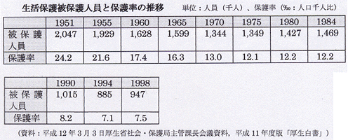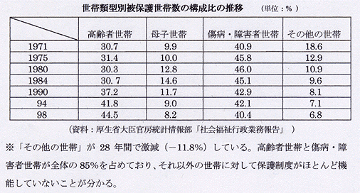 ※「その他の世帯」が28年聞で激減(一11.8%)している。高齢者世帯と傷病・障害者世帯が全体の85%を占めており、それ以外の世帯に対して保護制度がほとんど機能していないことが分かる。 ※注